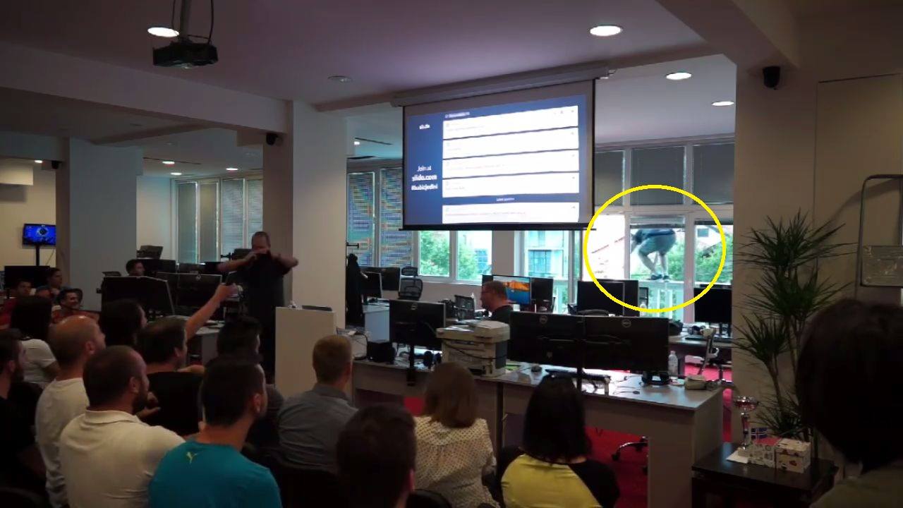 Sve je snimano kamerama, a njegov neočekivani potez izazvao je paniku i vrisak zapanjenih zaposlenika, ali već u sljedećoj sekundi na snimci se vidi kako Krezić, uz smijeh, slijeće na prethodno pripremljeni zračni jastuk. – piše 24sata