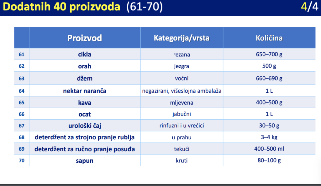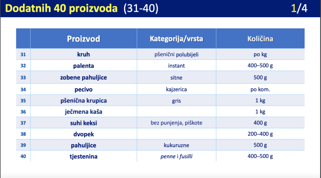 Na novom popisu dodaje se kruh, palenta, ječmena kaša, pahuljice, dvopek, tjestenina, suhomesnati proizvodi, konzervirani proizvodi, ribe, a tu su i dodatni mliječni proizvodi.