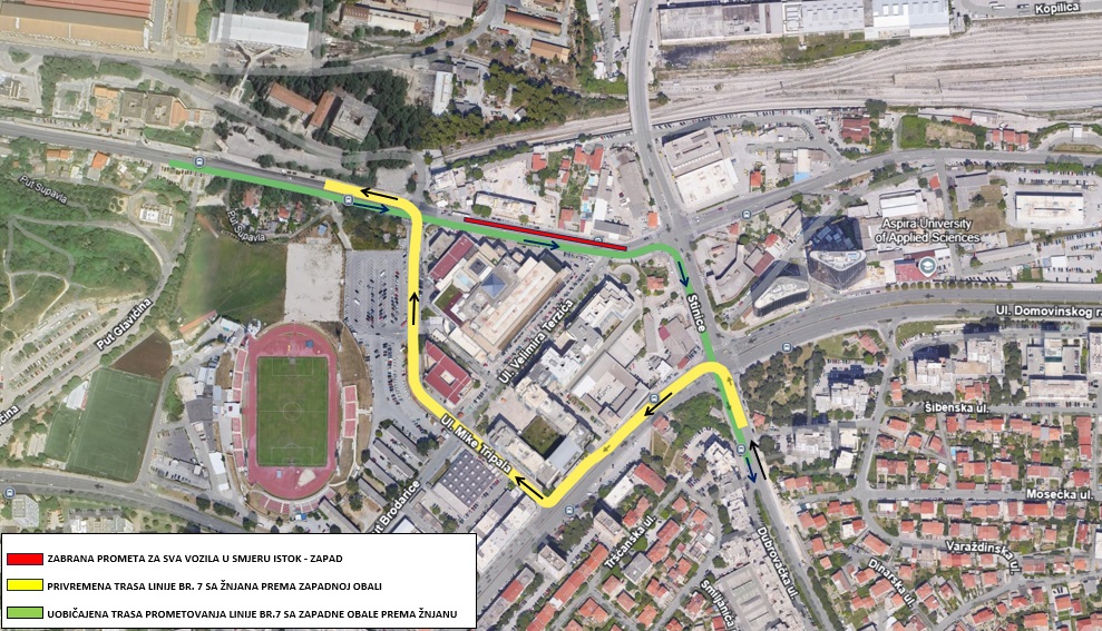 Od ponedjeljka, 13. siječnja 2025. (od 09:00 sati) zbog izvođenja radova na prometnici u Ulici Put Supavla (na sjevernoj strani kolnika) na dionici od križanja sa Ulicom Stinice i Hercegovačkom ulicom do križanja sa Ulicom Mike Tripala, autobusna linija br.7 u smjeru Žnjan – Zapadna obala do završetka radova privremeno će promijeniti trasu prometovanja kako slijedi: