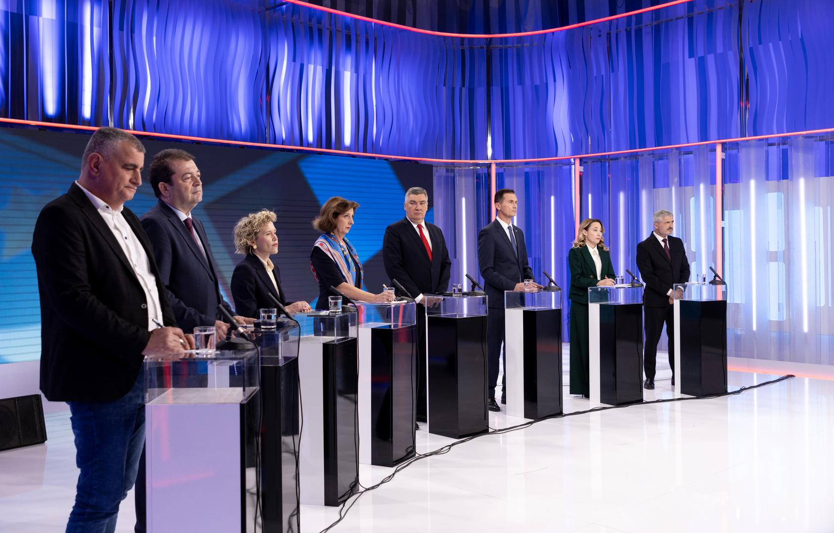 Osam predsjedničkih kandidata na sučeljavanju na HRT-u izrazilo je u ponedjeljak sućut zbog napada u OŠ Prečko u kojem je ubijen sedmogodišnjak, a potom su se uvodno obratili govoreći o tome tome kakav predsjednik ili predsjednica treba Hrvatskoj. U prvom setu pitanja iznijeli su stavove oko obrambene politike i sigurnosti, prilikom čega je, uz međusobna podbadanja, većina naglasila da kao predsjednici i Vrhovni zapovjednici neće dopustiti da naši vojnici ratuju u tuđim zemljama. Odgovarali su i na pitanja iz domene društva i ideologije, a većina ih se slaže da je stanje u zdravstvu i pravosuđu katastrofalno, pri čemu su kao ključni problem za građane naveli nedostupno zdravstvo i nepovjerenje u pravosuđe.