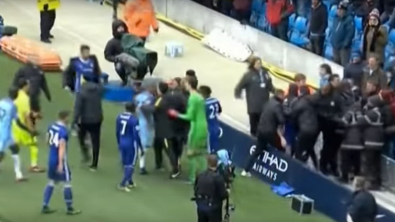 U sedmoj minuti sudačke nadoknade zbog grubog starta na Davidu Luizu isključen je domaći napadač Sergio Aguero, a u istoj minuti zbog hvatanja Fabregasa za vrat i Fernandinho nakon što su igrači Citya posve izgubili živce. Potom je nastala skoro opća tučnjava domaćih, u koju su se uključili i navijači.