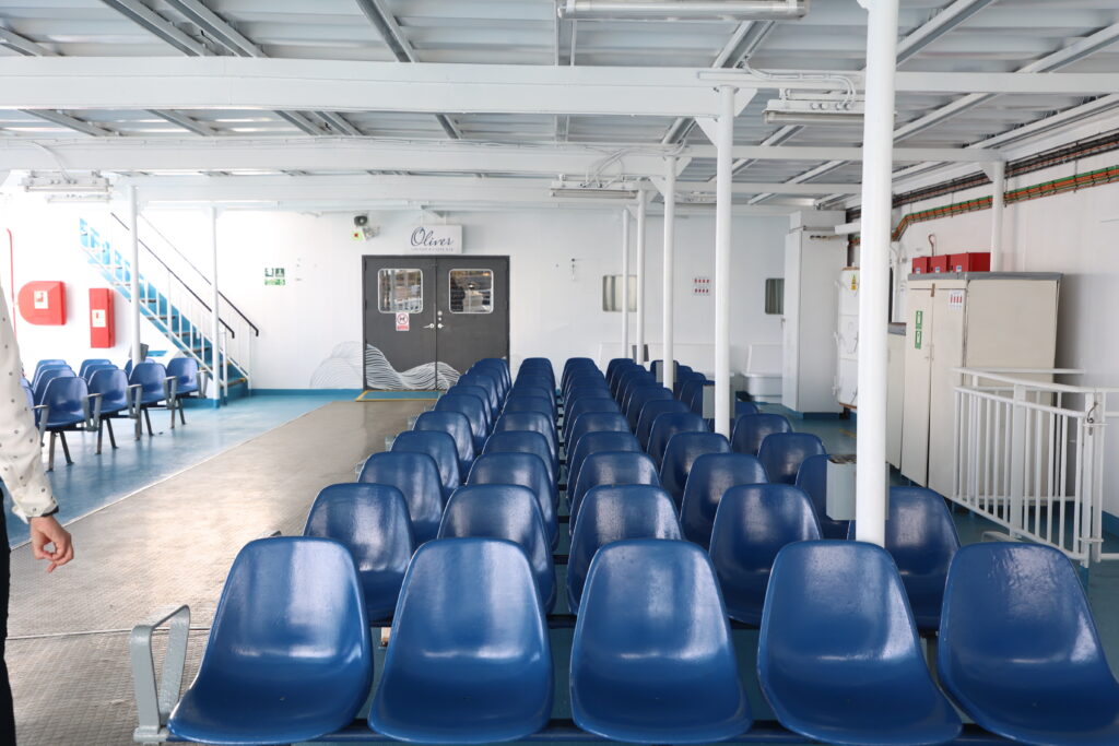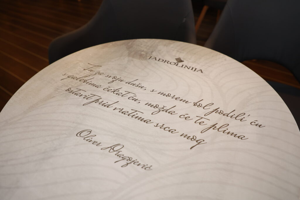A Oliverove pjesme sviraju sa zvučnika, stihovi su ispisani po stolovima i zidovima, kako god se okreneš i Oliver u slici kao da plovi zajedno sa putnicima. Ukupno ih na brod može gotovo sedam stotina, uz još stotinjak vozila. Dužinu smo već otkrili (108 metara), a onda je red kazati i kako je trajekt koji će prometovati na relaciji između Splita, Vele Luke i Ublija širok 17 i pol metara.