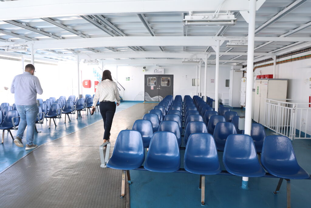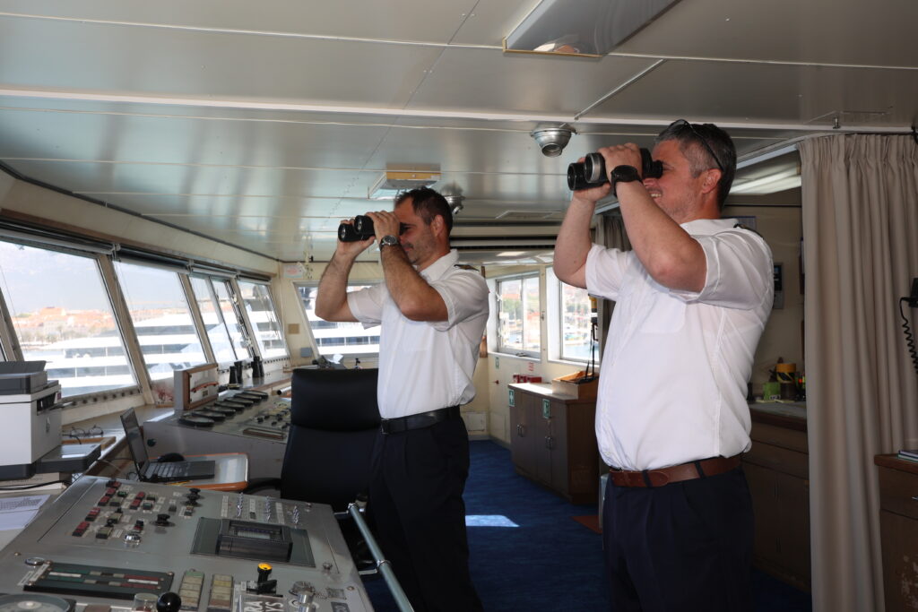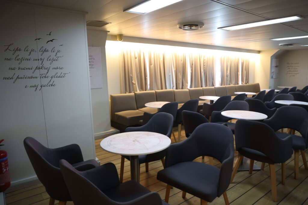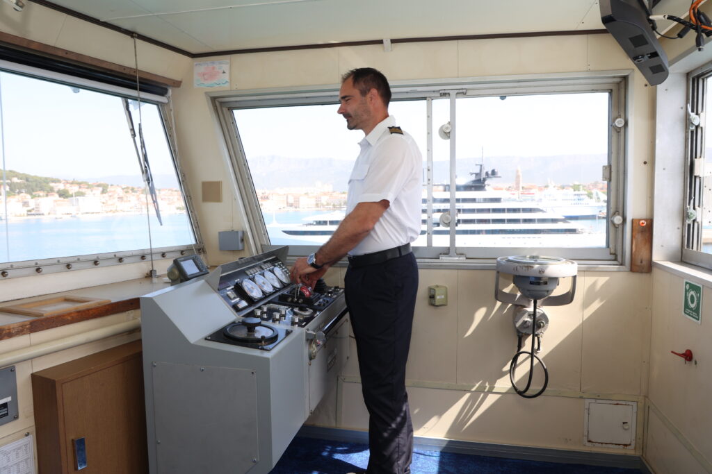 Njezin plan da prvo na miru popričamo sa zapovjednikom i njom, a da zatim krenemo u obilazak broda, a onda ugostiteljski dio – bespogovorno prihvaćamo. Vidi se da je osoba od organiziranja i efikasnosti. Legendarni Mrvica koji je partio na neka mirnija mora, a bio je baš maher u poslu, govorio je da je jedan dan zimi kad ne idu trajekti teži nego cijela sezona kad se svašta događa, a kakav je tek dan kad novi dio obitelji hrvatskog giganta prvi put preko mora otisne putnike i sve njihove potrebe. Znate ono, kad “stane” trajekt, kao da si stavio barikade na cestu. Putnici zovu, mora se opskrbiti otok, netko mora u liječnika… Trema hvata i nas koji smo poslom tu. Trajekt koji je napunio dvadeset i sedmu godinu prošlog mjeseca prvi je put trebao isploviti prije mjesec dana svečano, praćen sirenama s brodica, no sve je naprasno otkazano jer su na njemu uočeni nedostaci. O čemu se radilo, nitko nikad ni riječi nije rekao. Vjerojatno niti ne planira. Ova – druga sreća – prošla je gotovo bez najava, ali ne promakne baš puno toga tim novinarima…