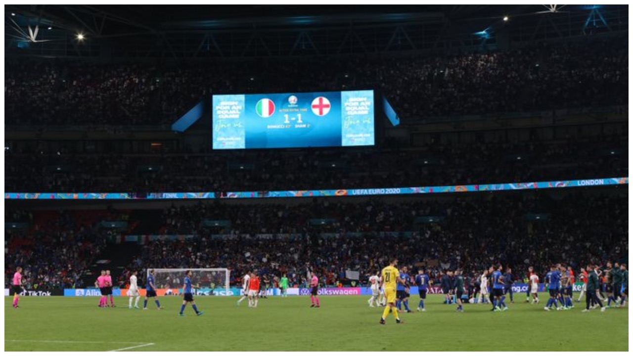 Nakon 90 minuta bilo je 1:1, a rezultat se nije mijenjao ni nakon 120 minuta igre. Za Englesku je na otvaranju utakmice u drugoj minuti zabio Luke Shaw, a rezultat je izjednačio Leonardo Bonucci u 67. minuti.