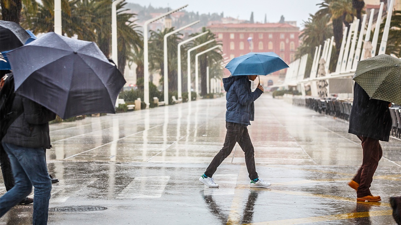 Kišno i tmurno jutro je na Splitskoj Rivi. Nakon niza sunčanih i vedrih dana, danas je Dalmaciju zahvatila nova ciklona koja je donijela obilnu kišu i olujno jugo.
