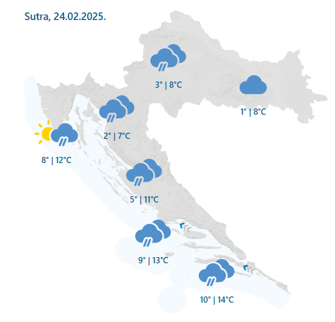 Temperatura zraka ujutro će se kretati od -1 do 4°C, na Jadranu od 6 do 11°C. Najviša dnevna temperatura bit će između 7 i 11°C, a na Jadranu od 11 do 14°C.