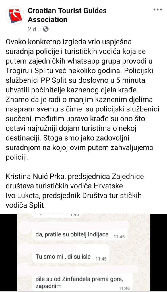 -Policijski službenici PP Split su doslovno u 5 minuta uhvatili počinitelje kaznenog djela krađe. Znamo da se radi o manjim kaznenim djelima, no krađe ostavljaju najružniji dojam turistima o nekoj destinaciji. Stoga smo jako zadovoljni suradnjom i zahvaljujemo policiji, izjavila je Kristina Nuić Prka, predsjednica Zajednice društava turističkih vodiča Hrvatske. Ivo Luketa, predsjednik Društva turističkih vodiča Split, također je pohvalio suradnju.