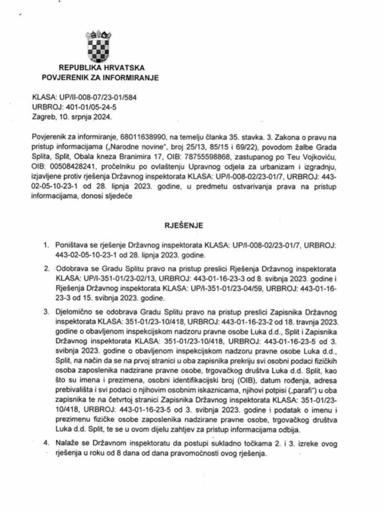 Poništeno rješenje Državnog inspektorata, Ivošević: “Nezakonito je odbio dostaviti Gradu Splitu informacije”