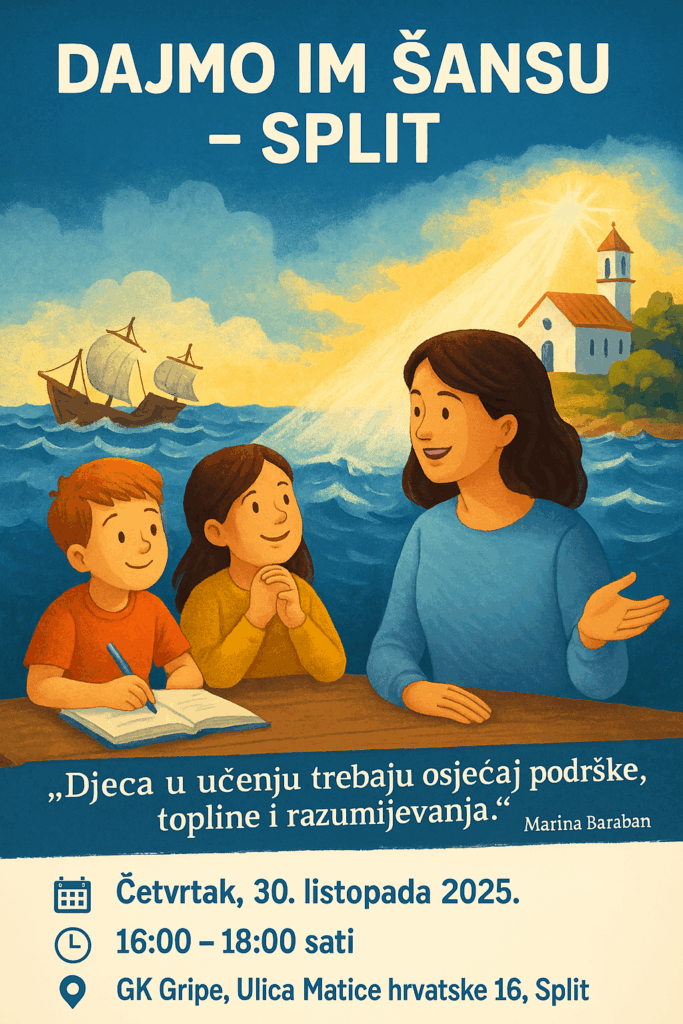 U četvrtak, 30. listopada, u Splitu će se održati nova aktivnost u okviru programa „Dajmo im šansu”, koji pruža individualnu podršku djeci u učenju i razumijevanju školskog gradiva. Program će se održati u prostorijama Gradskog kazališta Gripe (Ulica Matice hrvatske 16) od 16 do 18 sati, a vodit će ga Marina Baraban.