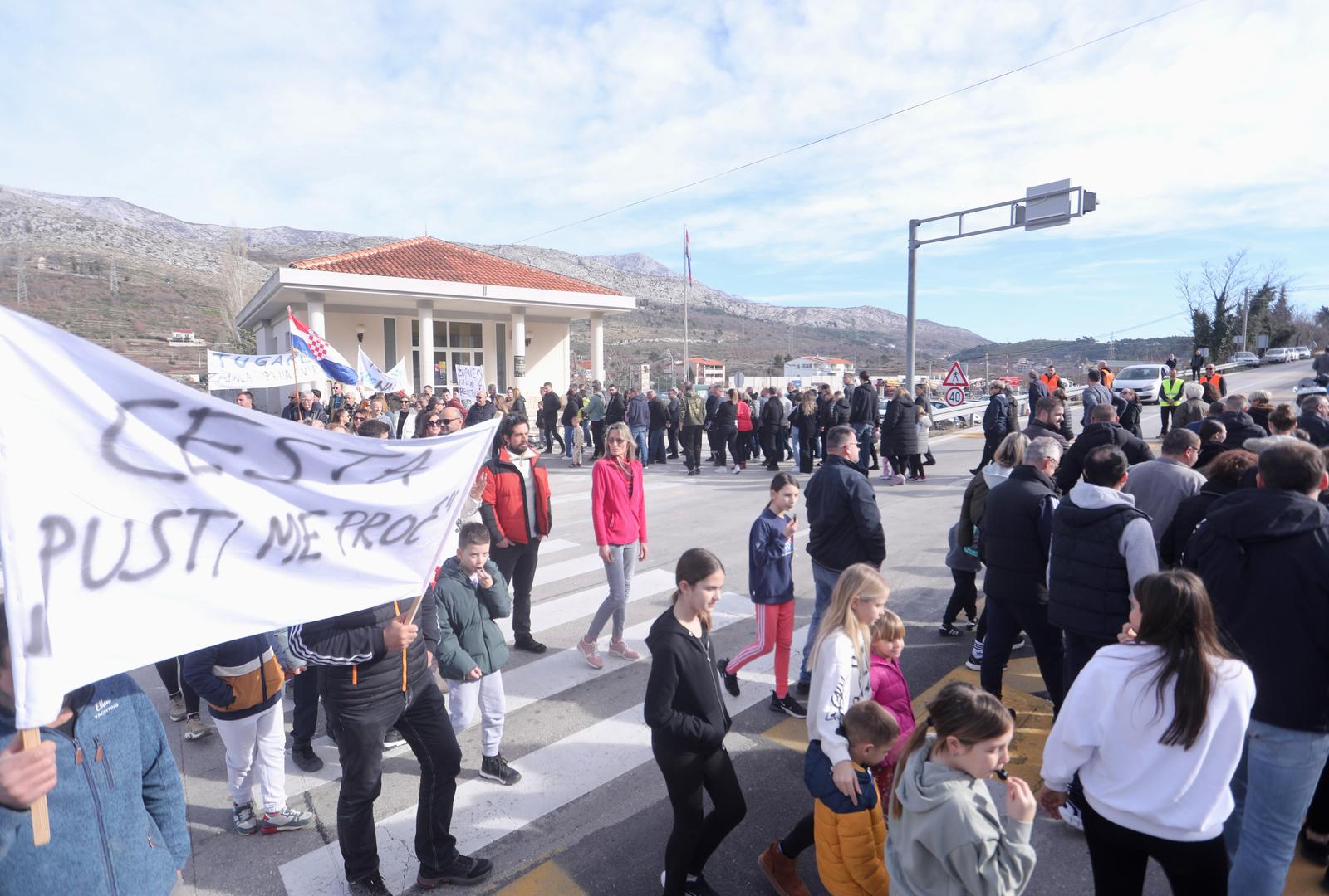 - 03.02.2023., Tugare – Mjestani Tugara prosvjedovali su prelaskom preko pjesackog prijelaza nezadovoljni zbog problema koji ce im donijeti otvorenje mosta preko Cetine. Otvorenjem mosta, njihovim prometnicama povecat ce se promet. Photo: Ivo Cagalj/PIXSELL