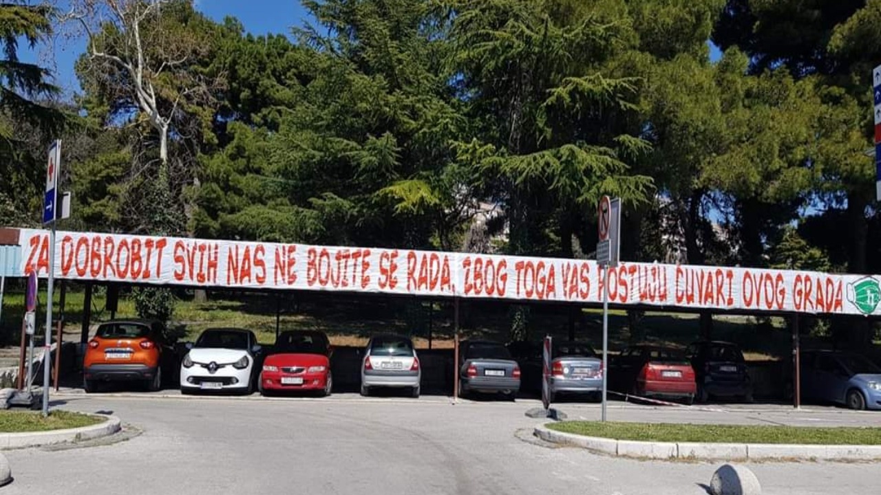 Naime, na parkiralištu bolnice Križine, koja je inače predviđena za zaražene koronavirusom, osvanula je predivna poruka podrške koju su Torcidaši napisali i uputili liječničkom osoblju.