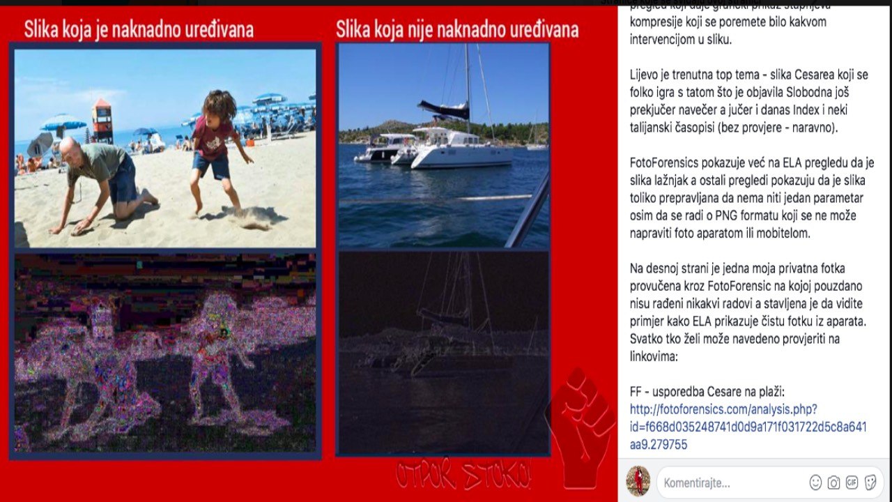 Testovi na toj stranici pokazuju brojne parametre temeljem kojih se može utvrditi autentičnost slike, od informacija o uređaju kojim je slikano, datuma nastanka slike pa do ovoga koji se zove ELA pregled koji daje grafički prikaz stupnjeva kompresije koji se poremete bilo kakvom intervencijom u sliku”.