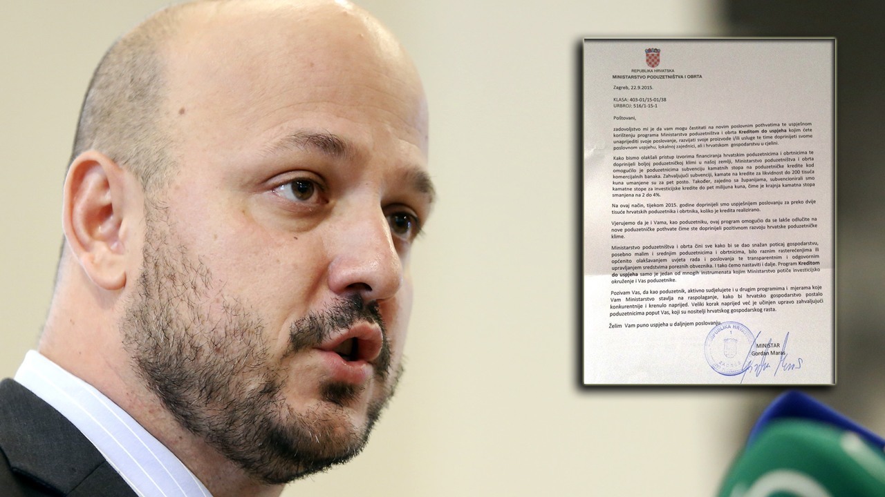 Tako je Ministarstvo poduzetništva i obrta s potpisom ministra Gordana Marasa počelo slati, baš u vrijeme izborne kampanje “Čestitku na novim poslovnim pothvatima te uspješnom korištenju programa Ministarstva poduzetništva i obrta Kreditom do uspjeha”.