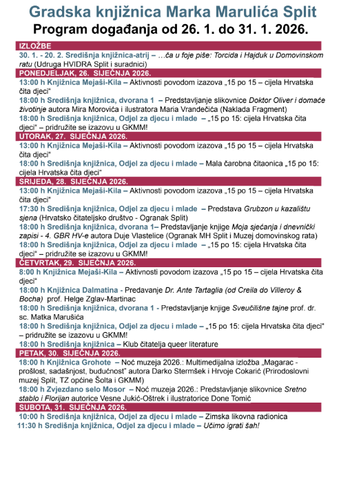 Gradska knjižnica Marka Marulića Split i ovoga tjedna, od 26. do 31. siječnja 2026., priprema bogat program događanja namijenjen svim generacijama. Posjetitelje očekuju izložbe, predstavljanja knjiga, predavanja, kazališni sadržaji, čitateljske aktivnosti te radionice za djecu i mlade.