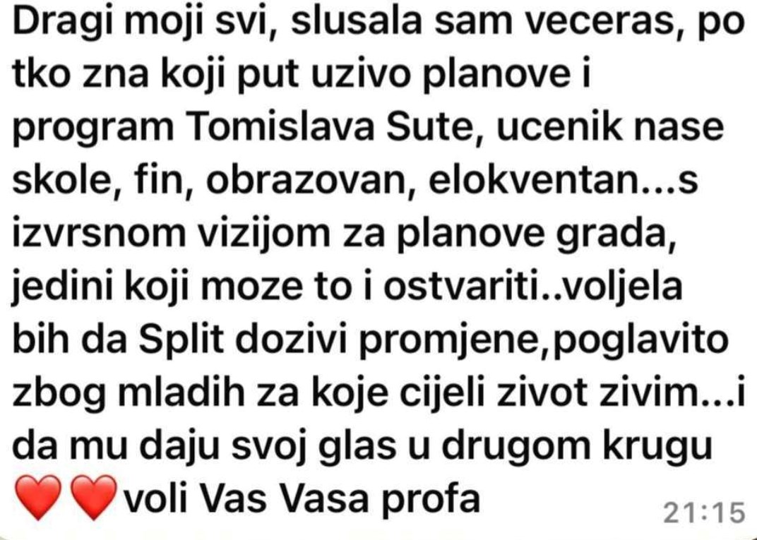 – Dragi moji svi, slušala sam večeras, po tko zna koji put uživo planove i program Tomislava Šute, učenik naše škole, fin, obrazovan, elokventan…s izvrsnom vizijom za planove grada, jedini koji može to i ostvariti..voljela bih da Split doživi promjene, poglavito zbog mladih za koje cijeli život živim…i da mu daju svoj glas u drugom krugu … voli Vas Vaša profa – napisala je, prenosi Index.