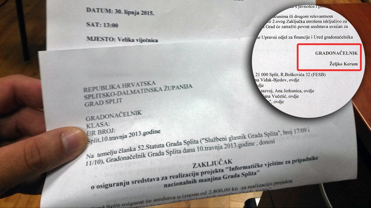 S jedne strane info papira stoji prijem kod gradonačelnika, a prima predsjednik Gradskog vijeća Grada Splita Boris Ćurković u 2015. godini, dok s druge strane piše Zaključak o osiguranju sredstava za projekt iz 2013. godine dok je gradonačelnik bio Željko Kerum.