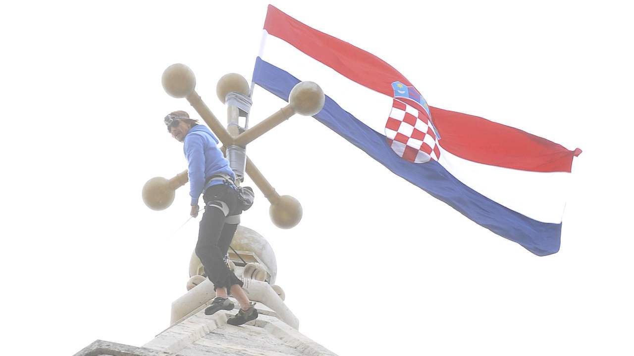 Duje na vrhu zvonika katedrale na splitskom Peristilu izvjesio zastavu Republike Hrvatske.