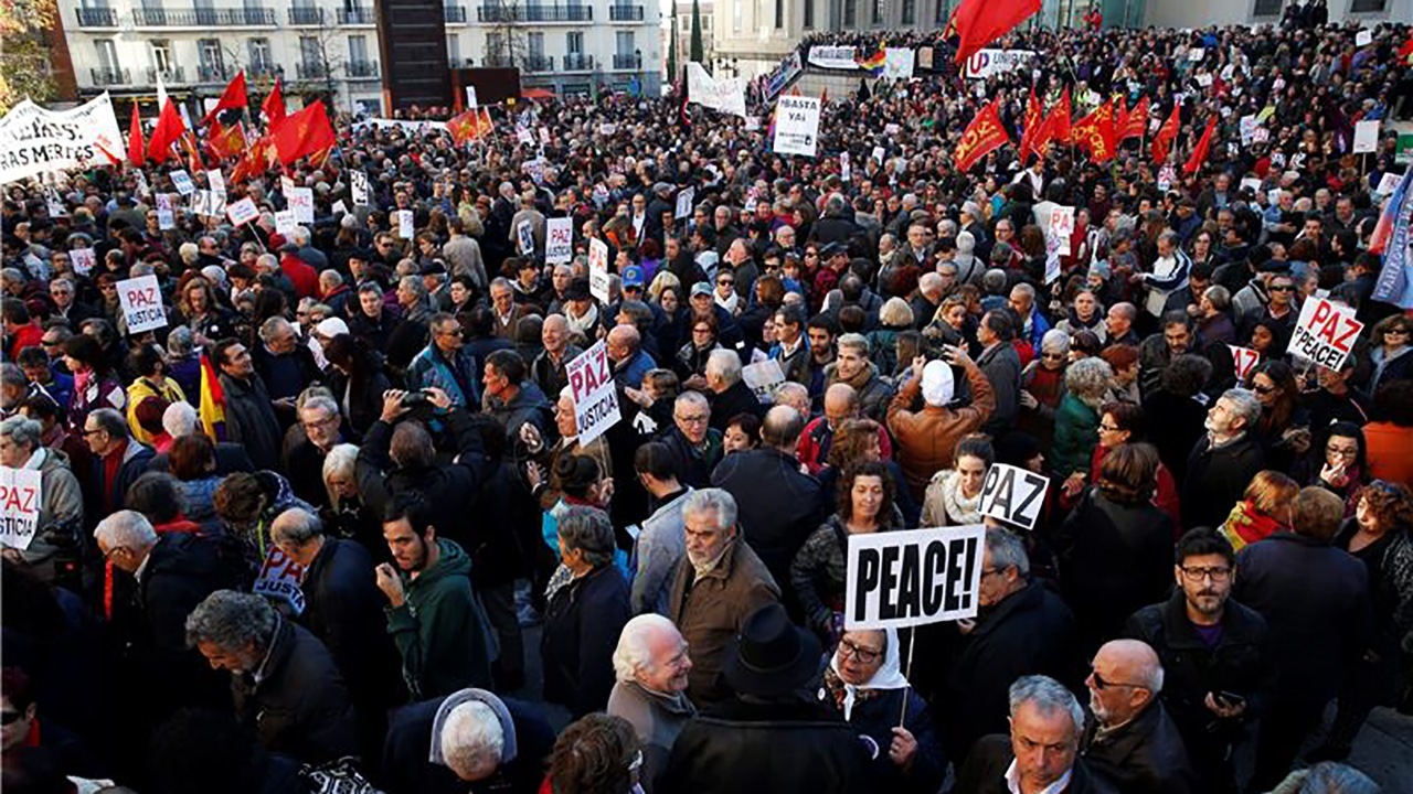 Okupili su se na poziv građanske platforme “Ne u naše ime” koju su pokrenuli umjetnici, a koja je u manje od tjedan dana skupila oko 34.000 potpisa na internetu, među kojima i gradonačelnika Madrida i Barcelone protiv terorizma i oružanog rješenja nakon atentata u Parizu 13. studenoga u kojem je poginulo 130 osoba i više od 350 je ranjeno.
