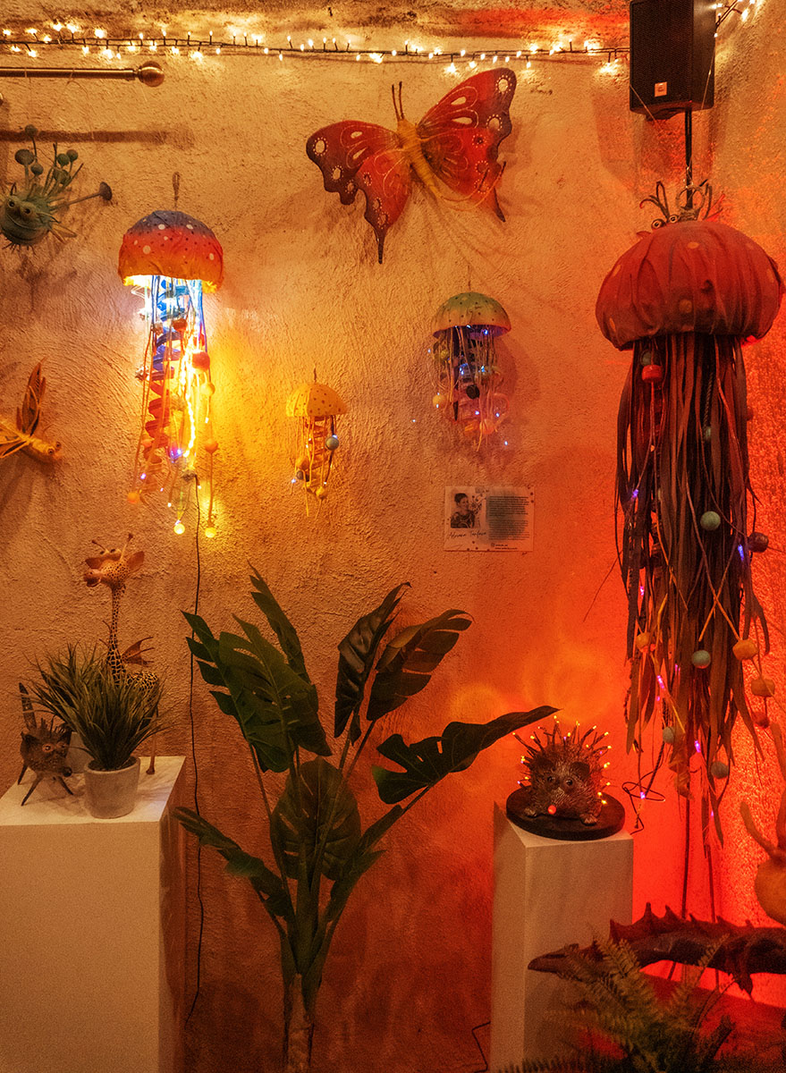 Andriana Tanfara, rođena Beograđanka s adresom u Šibeniku i obrazovanjem u Zagrebu, poznata je šibenskoj publici kroz svoje prisustvo na brojnim skupnim izložbama. Njeni radovi, poznati po jedinstvenoj tehnici kaširanja, predstavljaju šarene i vesela bića koja izviru iz svijeta mašte. Koristeći reciklirane materijale poput starih kablova, biciklističkih guma i istrošenih žarulja, Tanfara stvara umjetnička djela koja istražuju nove dimenzije svjetlosti i boje.