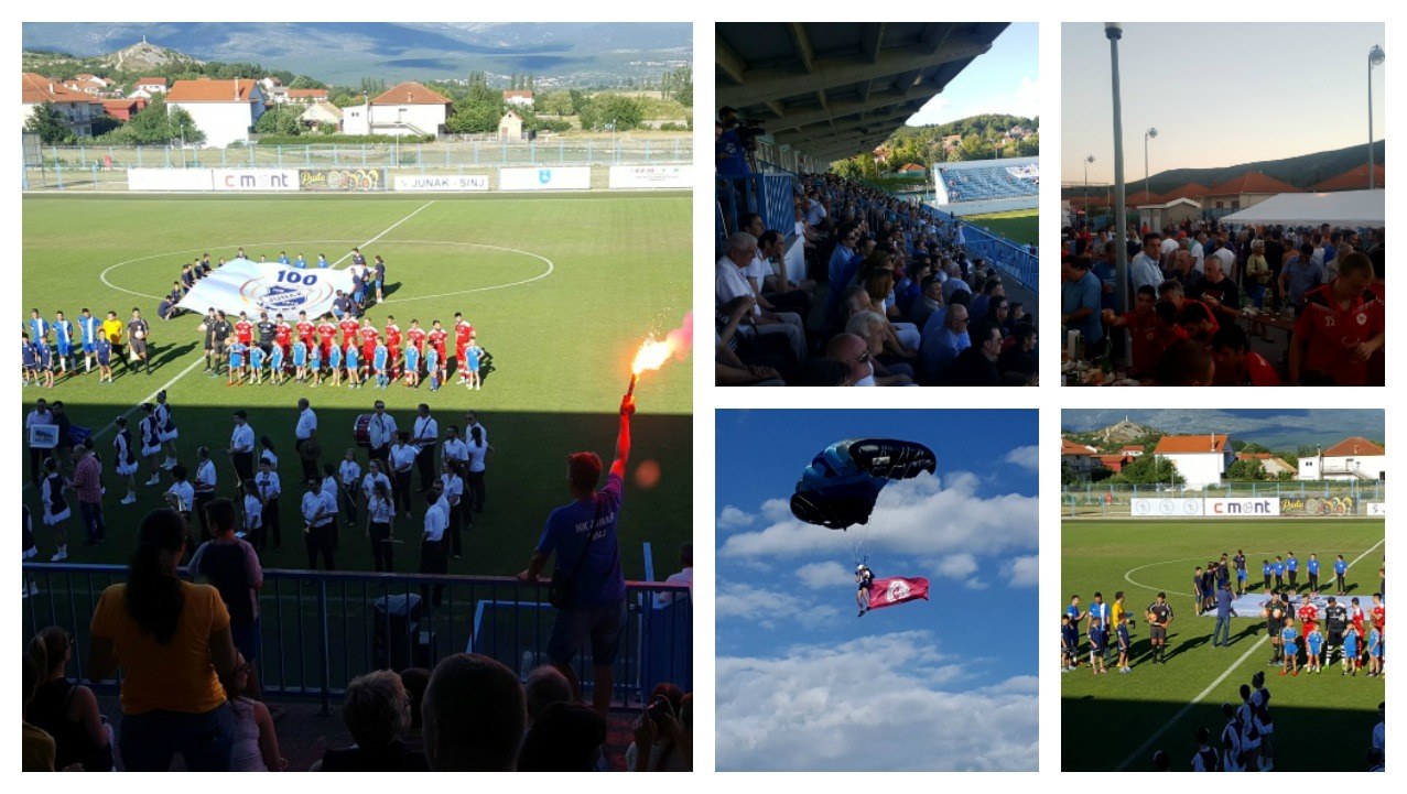 Stogodišnjicu Junaka uveličala su i oba dalmatinska prvoligaša, Hajduk prije tjedan dana, te Split danas na vrhuncu proslave ove okrugle obljetnice. Sinjani su se zaista potrudili kako bi proslavu podigli na što veći nivo, na stadionu se skupilo gotovo dvije tisuće gledatelja, uoči početka susreta zasvirala je gradska glazba uz pratnju sinjskih mažoretkinja, a na središnji dio travnjaka iz zraka su se spustila četiri padobranda noseći zastave – Hrvatske, Sinja, Junaka i RNK Splita.