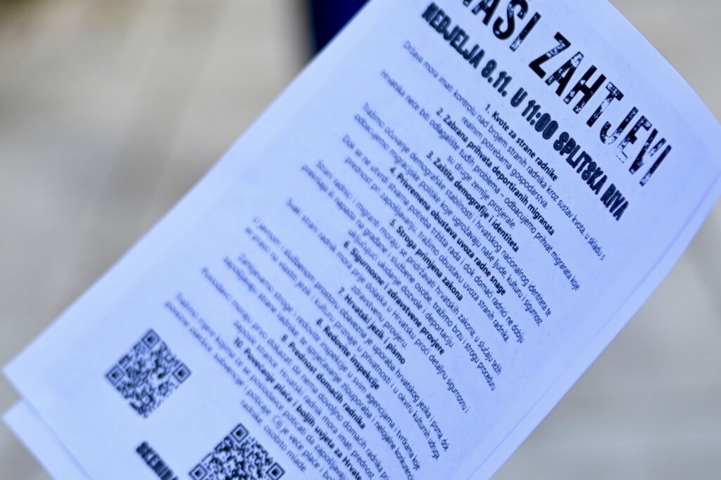 Skup je službeno otvoren uz povike i parole. Organizator prosvjeda, Ronaldo Barišić, pozvao je prisutne uz krik “Hrvatska Hrvatima!” i potom predstavio deset zahtjeva Udruge za bolju Hrvatsku, uključujući i traženje izmjena zakona vezanih uz uvoz stranih radnika.