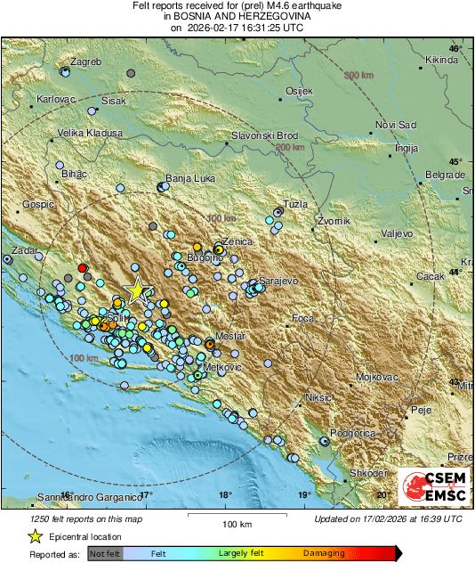Potres se dogodio u pograničnom području, a podrhtavanje tla osjetilo se i u dijelovima Dalmacije. Građani su prijavili da se potres osjetio u Split, Imotski i Sinj, kao i u okolnim mjestima.
