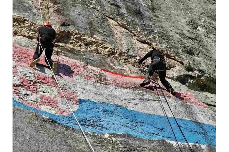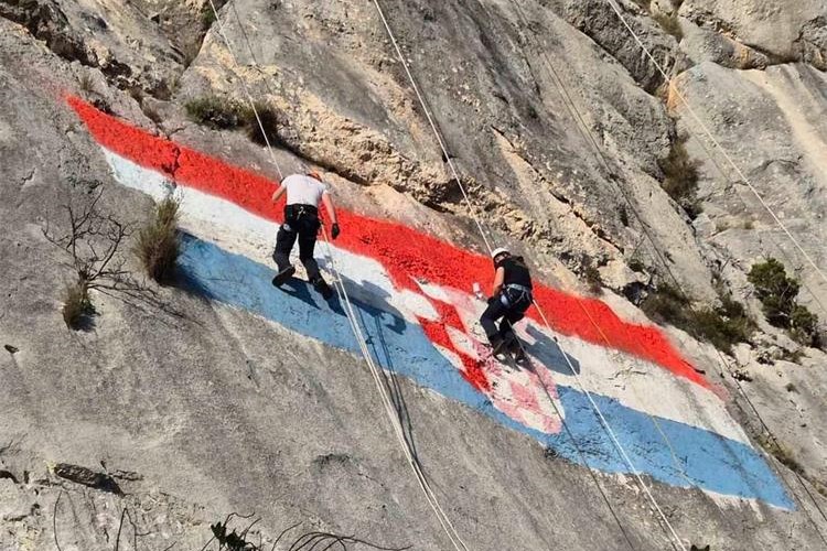 U zahtjevnom alpinističkom pothvatu obnovili su zastavu koja se na visini od 400 metara nalazi na tom mjestu još od vremena Drugog svjetskog rata nakon čega je izbrisana. Obnovljena je osnutkom Hrvatske države, da bi u vrijeme Domovinskog rata bila uništena ciljanim granatiranjem neprijateljske vojske. Ponovno je obnovljena 1993. i posljednji put 2008. godine.