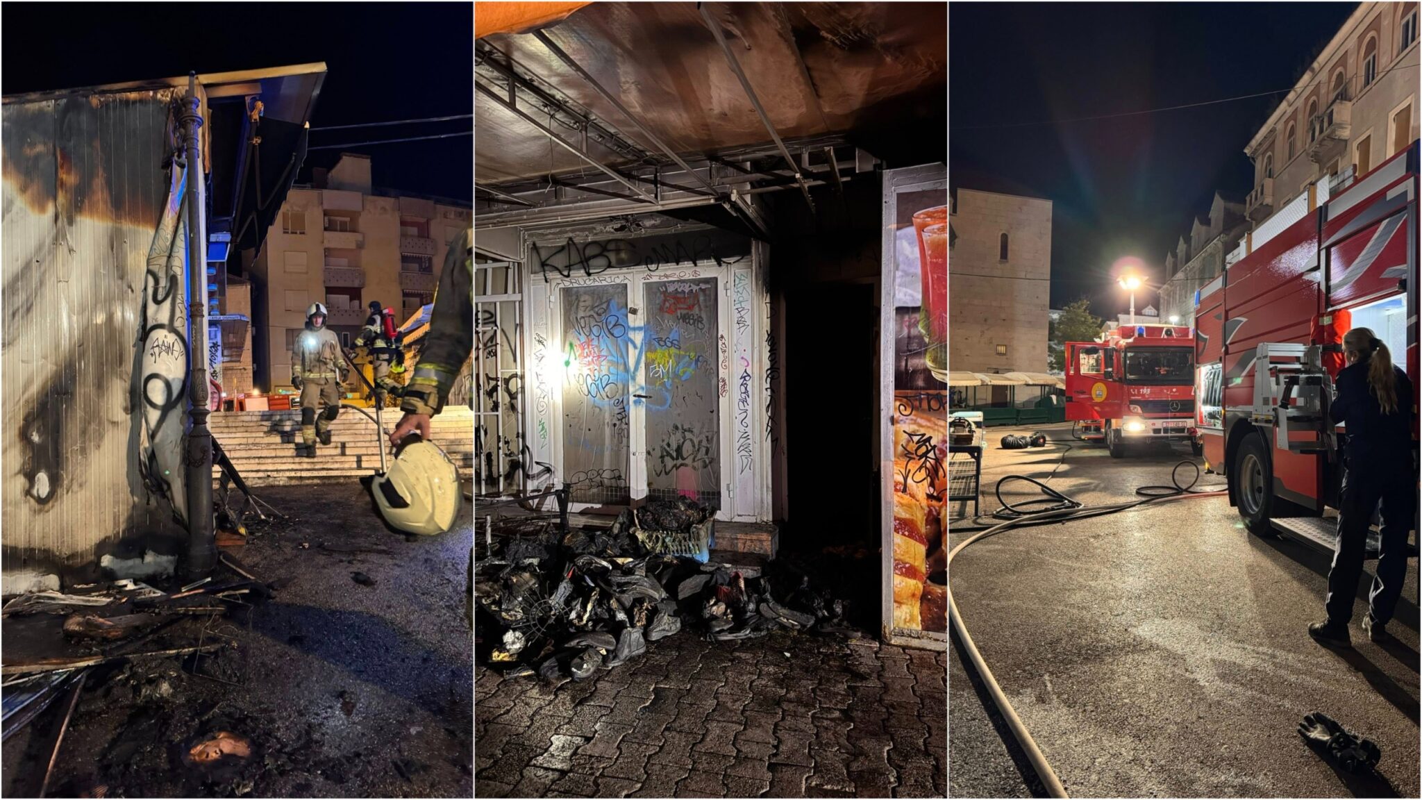 Očevidom je utvrđeno da je požar na suncobranu izazvan otvorenim plamenom, koji se potom proširio na kiosk s pršutima, potpuno uništivši sadržaj. Oštećenja su zabilježena i na susjednom kiosku, a ukupna šteta procjenjuje se na oko 25 tisuća eura.