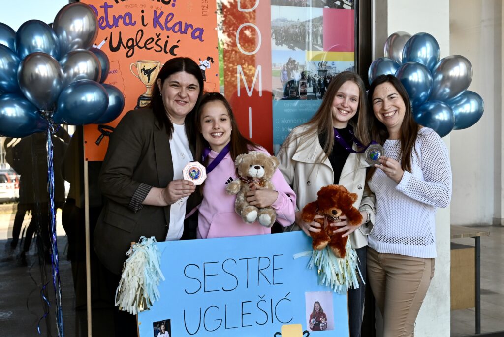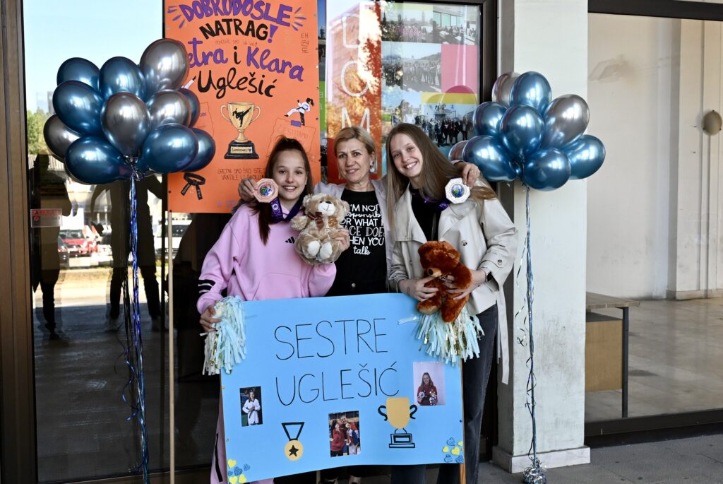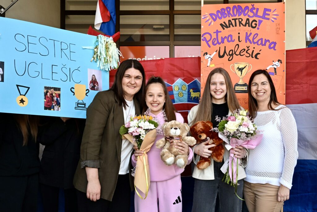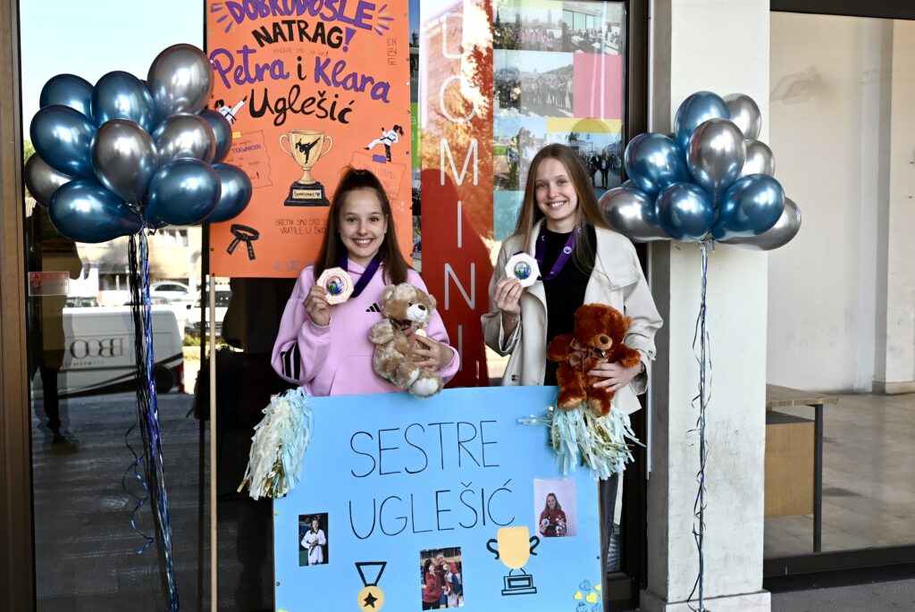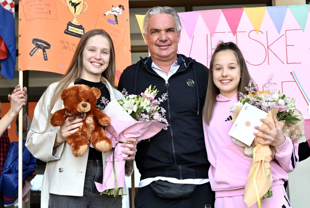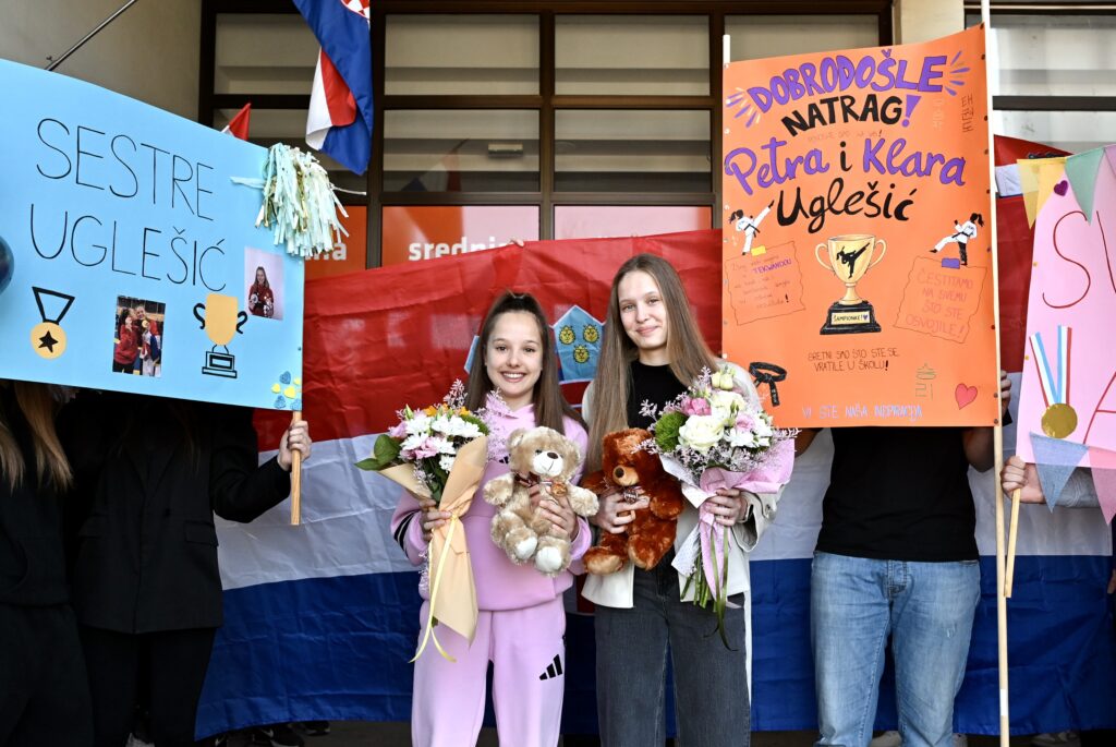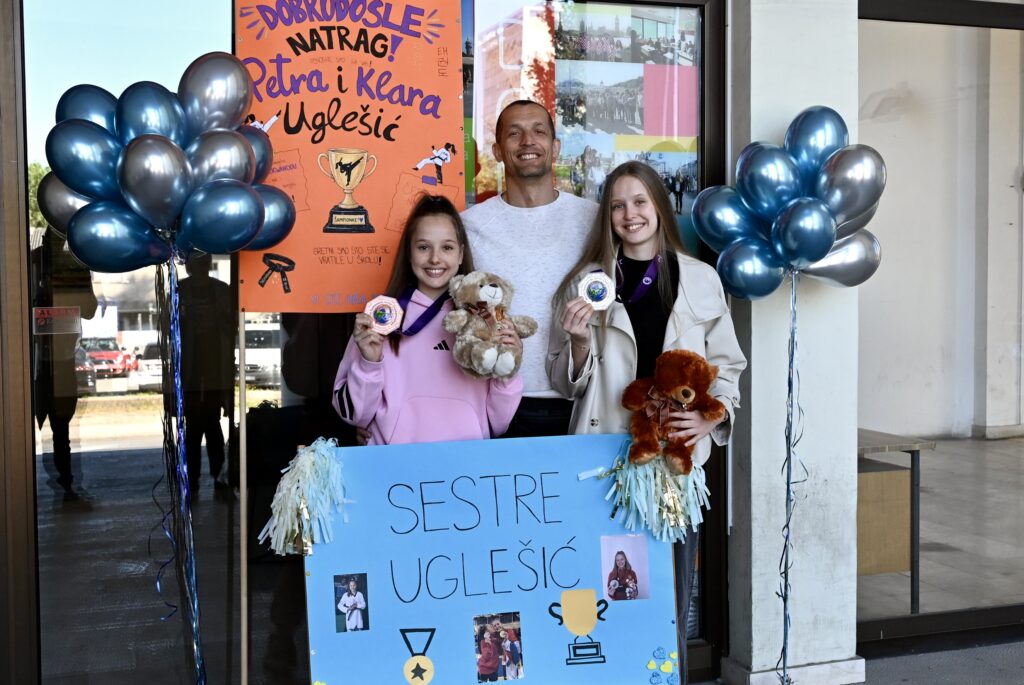Sestre Uglešić, Klara i Petra, stigle su među svoje školske kolege i profesore koji su im priredili srdačan i glasan doček. Klara je svjetska viceprvakinja u taekwondou, a Petra je kući donijela broncu!