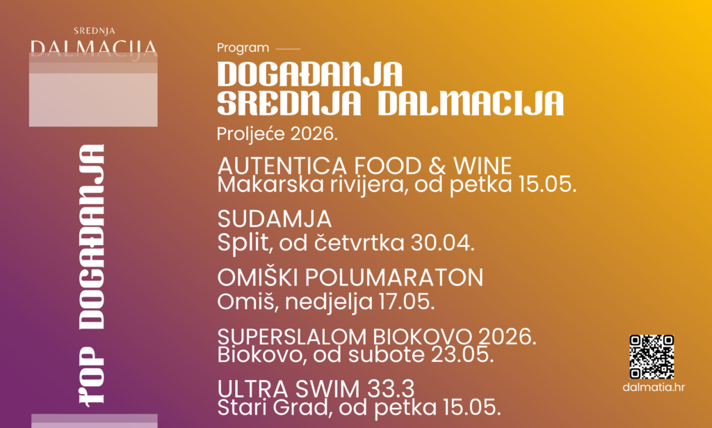Svibanj donosi snažan fokus na aktivni turizam i sport, čime se Srednja Dalmacija dodatno pozicionira kao idealna destinacija za boravak na otvorenom. Posebno se ističu međunarodno prepoznata događanja poput UltraSwim 33.3 (Stari Grad) i Omiškog polumaratona (Omiš), dok će ljubitelje izazova privući i Prvi superslalom Biokovo. Dodatnu vrijednost daje Svjetsko juniorsko prvenstvo u skyrunningu (Makarska) koje se održava kroz svibanj i lipanj, okupljajući mlade sportaše iz cijelog svijeta i potvrđujući status regije na globalnoj outdoor karti. Program je upotpunjen i nizom manjih kulturnih, zabavnih i eno-gastro događanja poput SlatCroFesta (Split) i Autentica Food & Wine festivala (Makarska rivijera).
