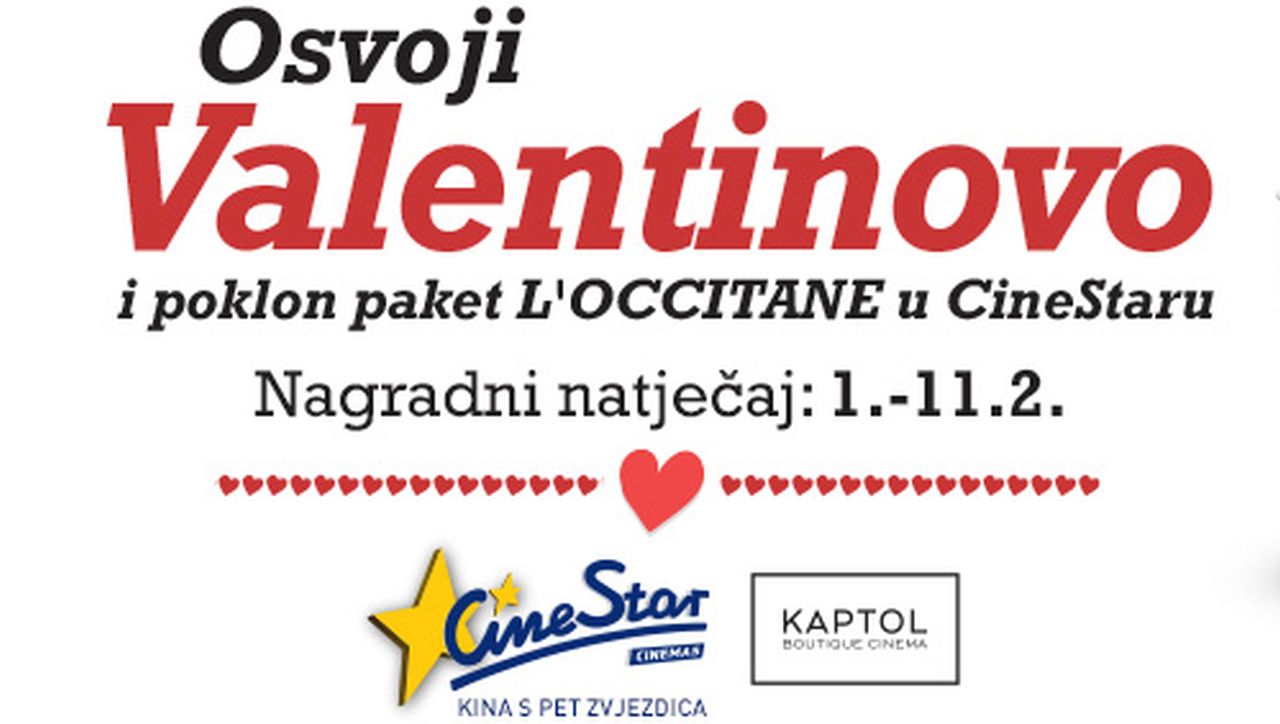 Ljubavni parovi Valentinovo doživljavaju kao pravi mali praznik, a gotovo je nezamislivo ne pokloniti mali znak pažnje svojoj boljoj polovici. S obzirom da većina poklone odabire u posljednji tren, učinite ove dane ususret Valentinova posebnim uz CineStar kina koja imaju odličnu ideju kako proslaviti mjesec ljubavi i iznenaditi svoje najdraže. U periodu od 01. do 11. veljače u CineStaru ili Kaptol Boutique Cinema pogledajte neki od najnovijih filmskih hitova, fotkajte se u paru, a fotku objavite na Facebooku ili Instagramu uz #ValentinovouCineStaru. Time sudjelujete u CineStarovom nagradnom natječaju gdje 10 parova može osvojiti izlazak za dvoje u CineStar i vrijedni L’Occitane paket.