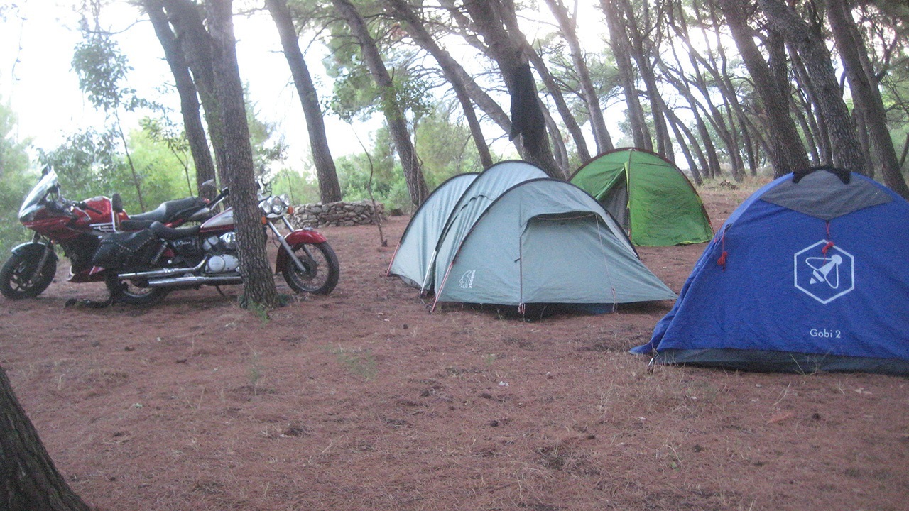 Obilazeći Tursku kulu jutros u ranim jutarnjim satima naišao sam na tri podignuta šatora u očišćeni dio parka uz koja su bila parkirana dva veća motora sa stranim registracijama. Svoje sam vozilo parkirao u njihovoj blizini, fotografirao sam šatore i uzeo alat za dotjerivanje dijela parka nedaleko njih.