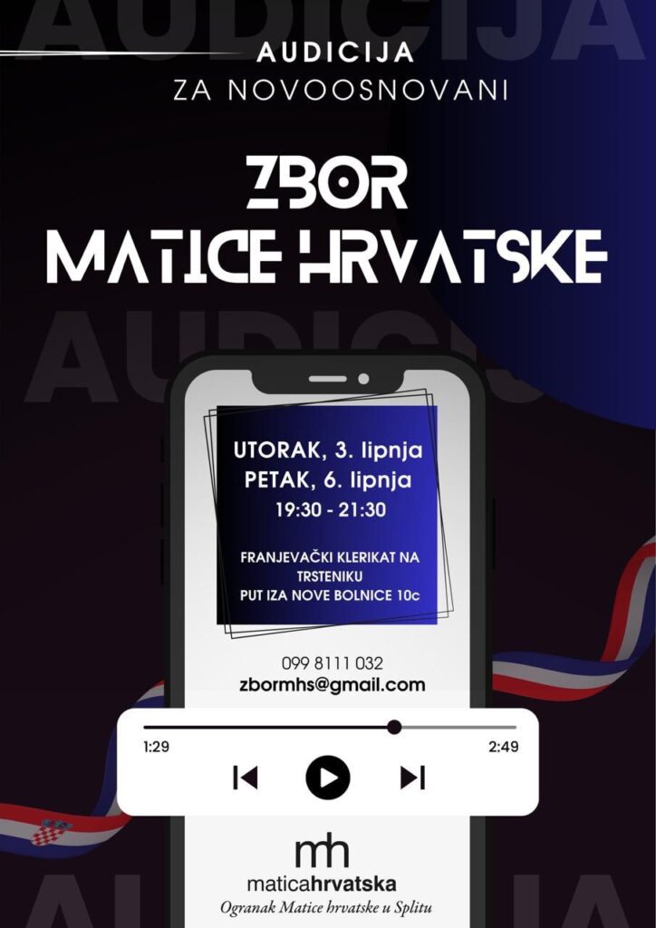 Matica hrvatska – Ogranak Split poziva sve zainteresirane pjevače na audiciju za novoosnovani mješoviti zbor koji će okupljati zaljubljenike u zborsku glazbu i graditi umjetnički prepoznatljiv ansambl u službi kulturne izvrsnosti.