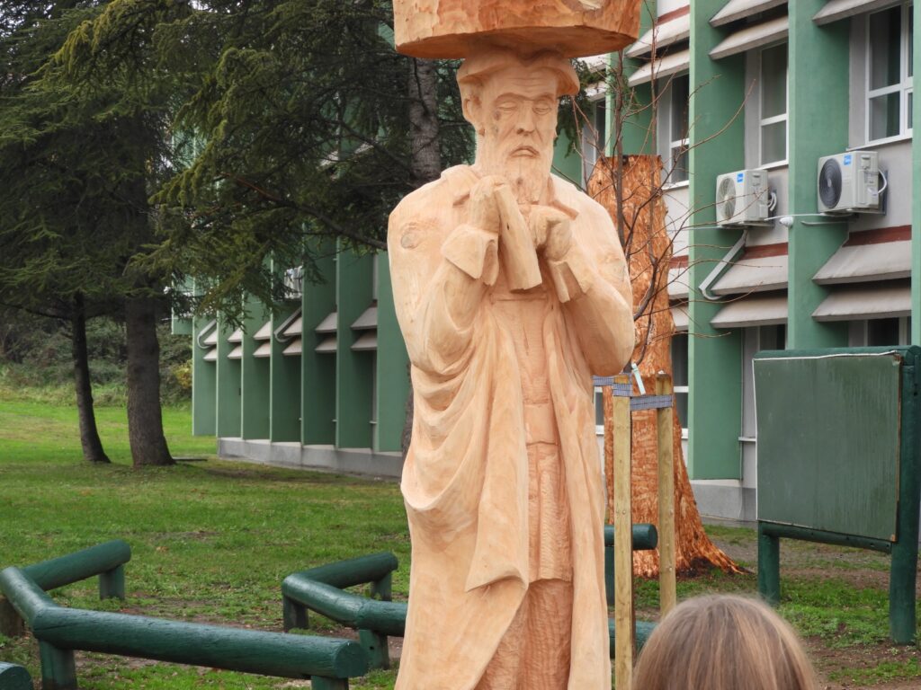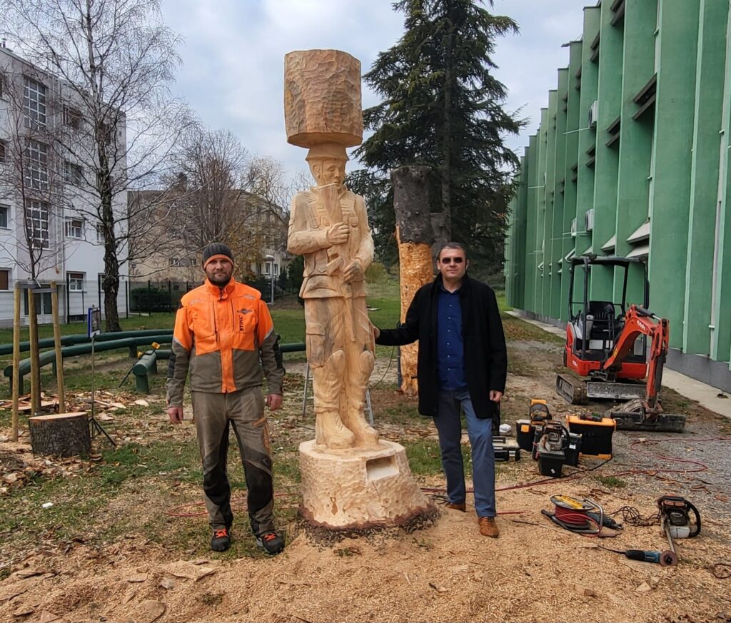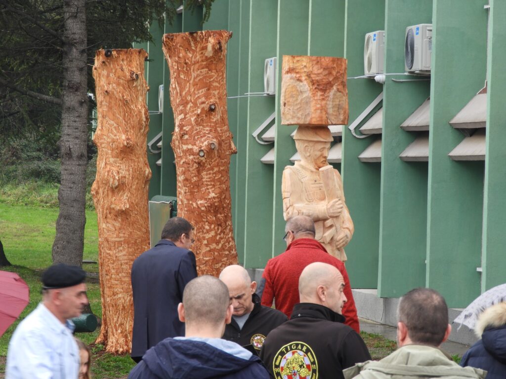 Umjetnik Posavec koristio je motorne pile i ručne alate za oblikovanje skulptura u stilu autohtone umjetnosti. Njegov rad pretočen je u živopisne detalje koji pričaju priču o važnim simbolima hrvatskog identiteta – književnosti i Domovinskom ratu.