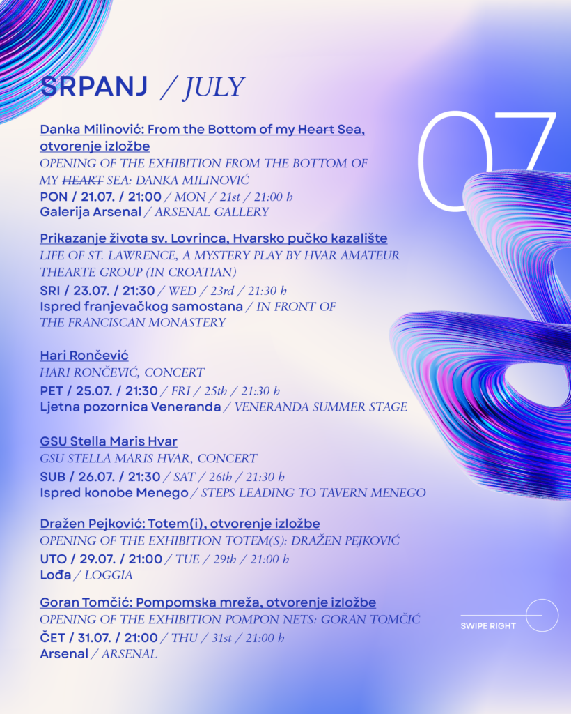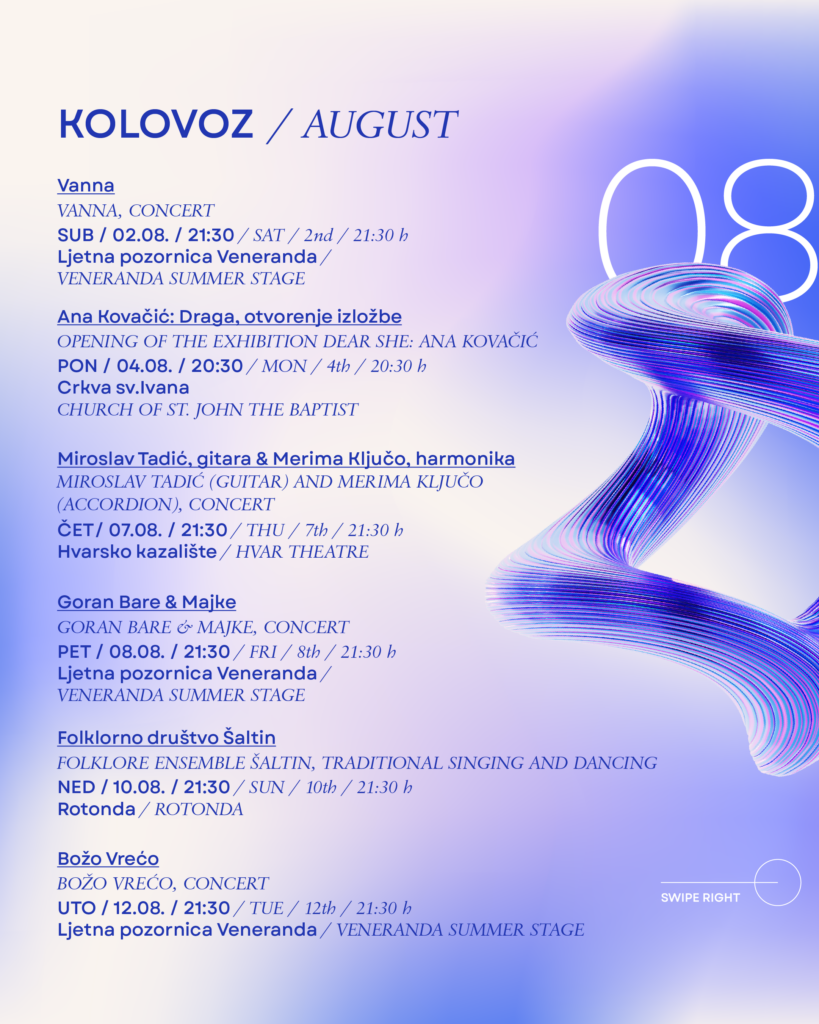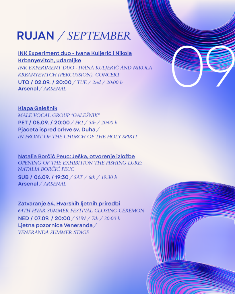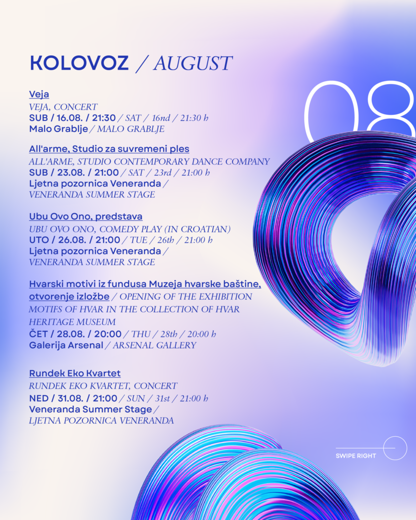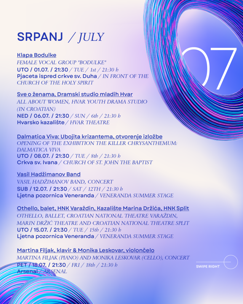 Hvarske ljetne priredbe već 64 godine snažno oblikuju kulturni identitet grada Hvara. U jedinstvenim prostorima – od Trga sv. Stjepana preko Ljetne pozornice Veneranda i Arsenala do najstarijeg javnog kazališta u Europi – ovaj festival nudi nezaboravno iskustvo gdje se povijest i umjetnost stapaju s mediteranskim načinom života.