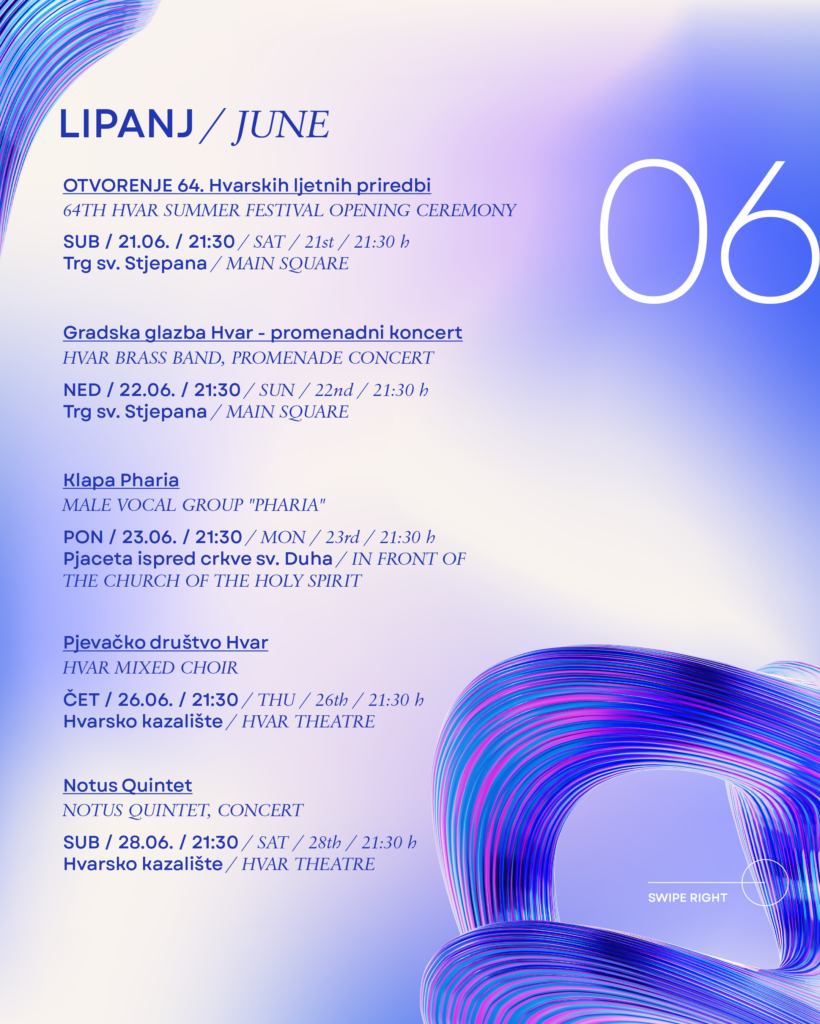 U srcu Mediterana, među kamenim zidinama i baroknim pročeljima Hvara, od 21. lipnja do 7. rujna 2025. održava se 64. izdanje Hvarskih ljetnih priredbi – jedne od najuglednijih i najdugovječnijih kulturnih manifestacija na obali.
