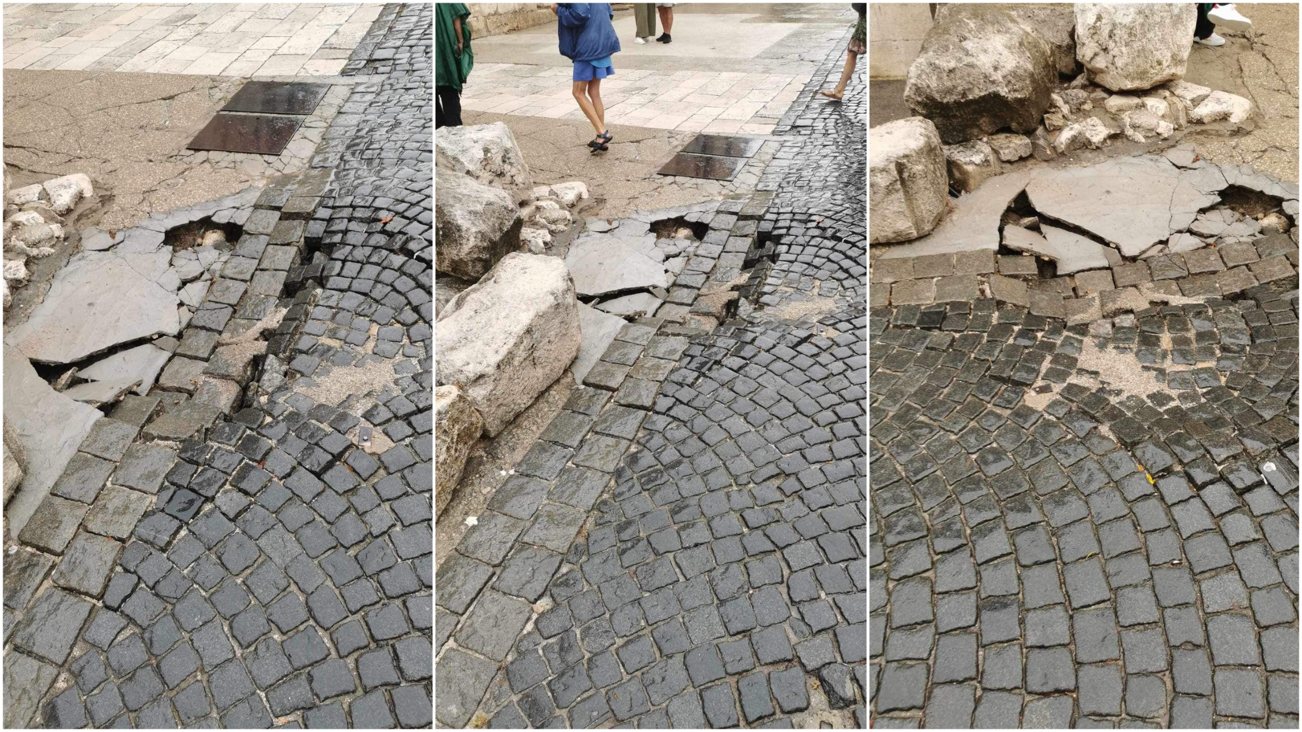 Poznata Facebook stranica Get Direkt podijelila je fotografije urušenih kamenih ploča u samom centru grada Splita, naglašavajući ozbiljnost situacije.