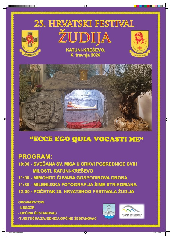 U župi Katuni-Kreševo, u općini Šestanovac, 6. travnja 2026. godine održat će se jubilarni 25. Hrvatski festival žudija, koji okuplja čuvare Kristova groba iz cijele Hrvatske i inozemstva.