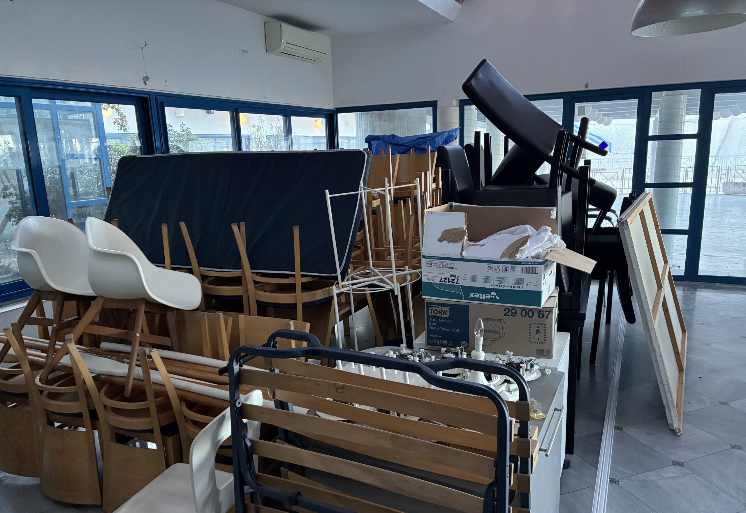 Kao “utješna nagrada” za sve koji bi ipak po niskim cijenama htjeli nabaviti neki od predmeta iz preostalog dijela hotela, pripremljen je “buvljak” sa stvarima koje će vjerojatno isto biti razgrabljene u ponedjeljak i utorak. Na hrpi smo snimili stolice, stolove, zvučnike…