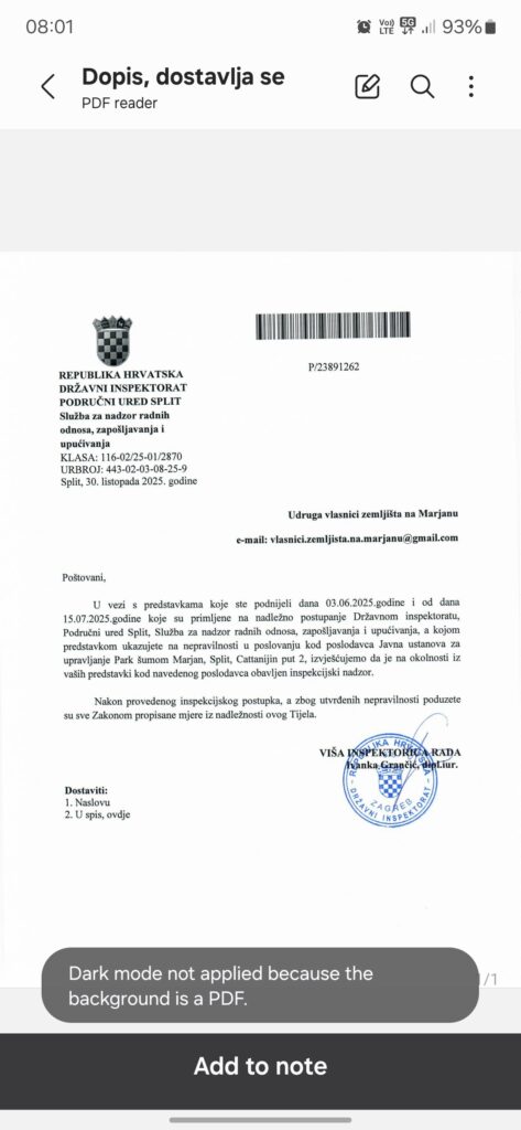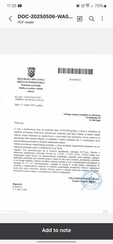 Državni inspektorat poslao je službeni nalaz o nepravilnostima u Javnoj ustanovi za upravljanje Park-šumom Marjan, i to uoči zadnjeg radnog dana ravnatelja Marka Pejnovića, kažu nam članovi Udruge Vlasnici zemljišta na Marjanu. Njihovo priopćenje prenosimo u cijelosti: