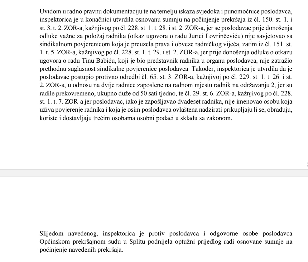 Mali detalj: Duje je sin Pejnovićeve tajnice. Au. - Nalaz iz izvještaja Ureda Pučke pravobraniteljice – potvrđeni prekršaji prema Zakonu o radu: nezakoniti otkazi, prekovremeni bez plaćanja, kršenje sindikalnih prava.