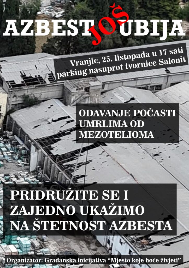 U subotu, 25. listopada, u Vranjicu će se s početkom u 17 sati održati skup i odavanje počasti preminulima od mezotelioma, smrtonosne bolesti povezane s izloženošću azbestu. Okupljanje će biti na parkingu nasuprot nekadašnje tvornice Salonit, simbola industrijske proizvodnje, ali i najvećeg izvora azbestne prašine koja je desetljećima ugrožavala zdravlje lokalnog stanovništva.