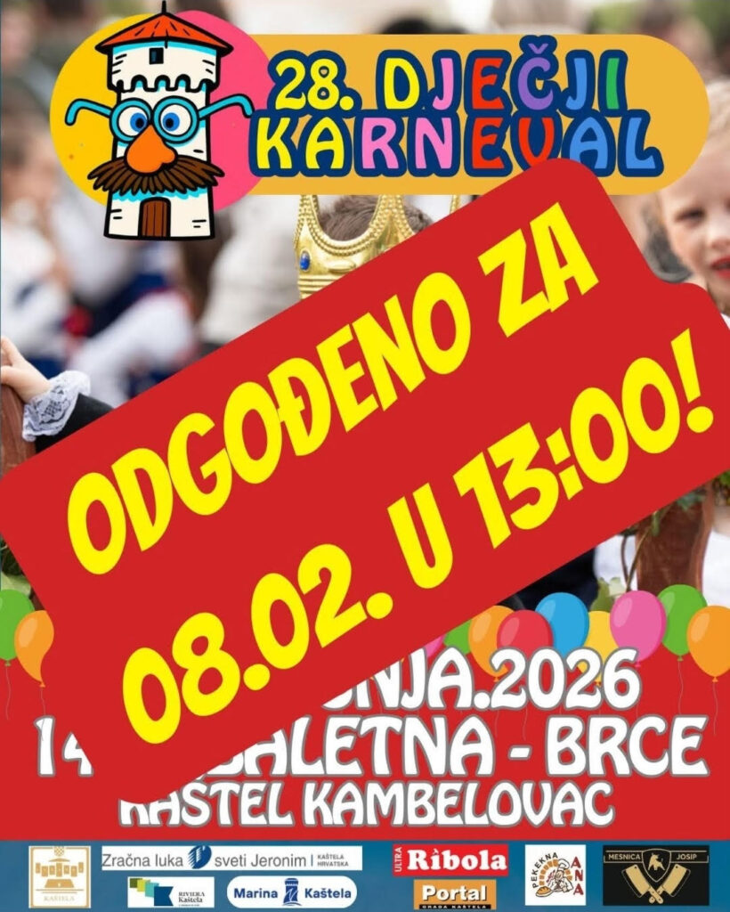U ovu nedjelju trebao se održati 28. po redu Dičji krnjeval u Kaštel Kambelovcu, ali zbog lošeg vremena i najavljene kiše, odgođen je za 8.2. u 13.00.