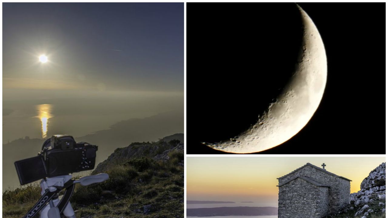 Mijo Jaredić boravio je na najvišim točkama Kozjaka odakle je snimio prekrasne panoramske prizora Splita, Kaštela, Solina i okolice, a fotografija mladog mjeseca iznad Kaštela samo je šlag na torti zadivljujućih prizora.