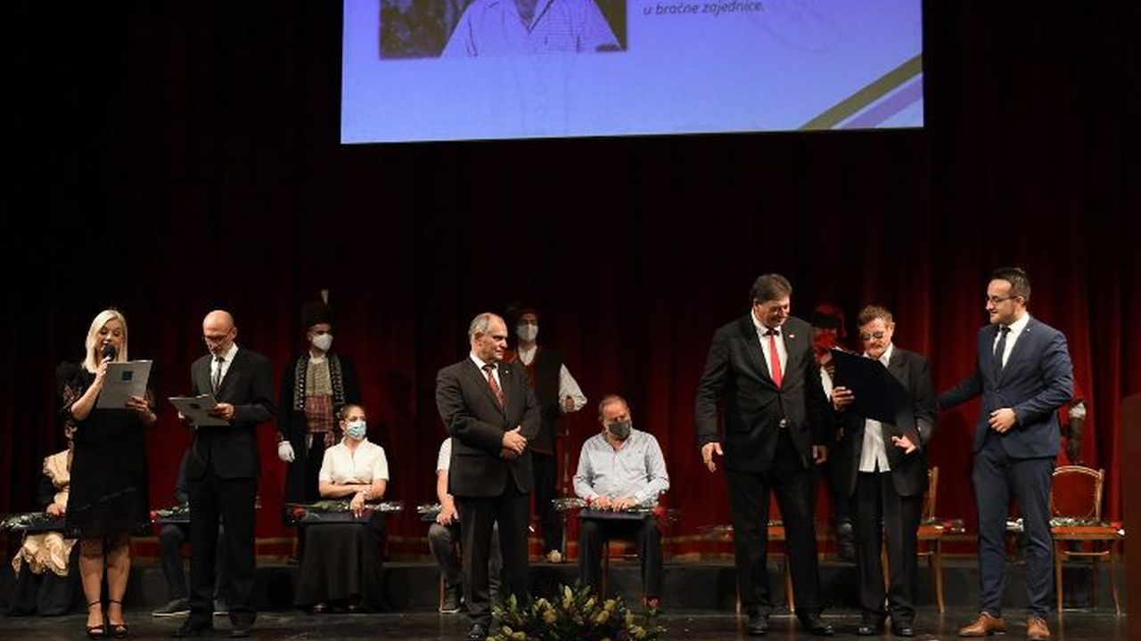 U najsvečanijem dijelu proslave uručene su ovogodišnje nagrade zaslužnim pojedincima i kolektivima. Županova povelja dodijeljena je posthumno akademiku Tonku Maroeviću.