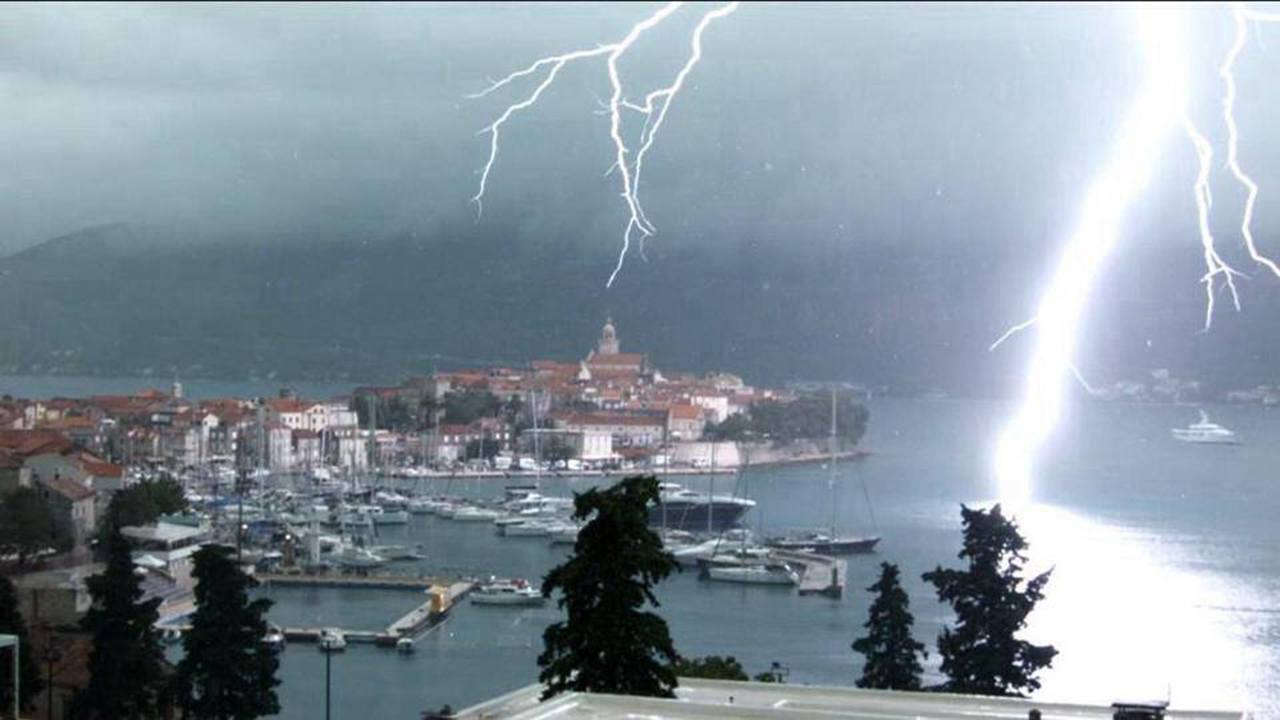 Internetom se širi zanimljiv video uradak kojega je u gradu Korčuli snimio Segi Sendra iz Barcelone. Na snimici se vidi silovit udar munje u more, dok se grane munje šire nebom i dotiči kupolu gradske crkve.