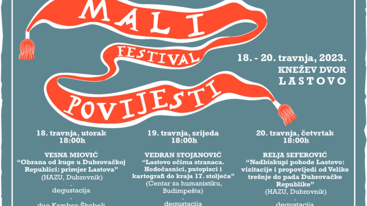 Turistička zajednica Općine Lastovo poziva na drugo izdanje Malog festivala povijesti koji će se održati u Kneževu dvoru u Lastovu od 18. do 20. travnja. Izlaganjima Vesne Milović i Relje Seferovića sa Zavoda za povijesne znanosti HAZU u Dubrovniku te Vedrana Stojanovića iz Centra za humanistiku u Budimpešti kontekstualizirat će se fragmenti osebujne lastovske povijesti, redom iz perspektive stranaca i otočkih prolaznika.