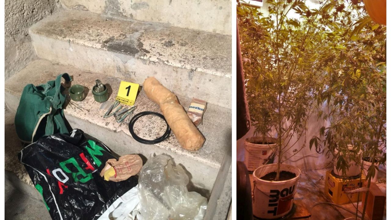 Temeljem sudskog naloga, jučer su u Splitu obavili pretragu njegovog stana i podrumskih prostorija, kojom prilikom su pronašli 15 stabljika cannabis sative, visine od 28 centimetara do 3 metra, 6.1 grama marihuane, 100 sjemenki kanabisa, 7 vrećica za pakiranje droge, digitalnu vagu za precizno mjerenje, pribor i oprema za uzgoj marihuane, 2 kg eksploziva amonal, ručnu bombu M52, 500 grama trotila, 3 trotilska metka težine 300 grama, 3 električne detonatorske kapisle, 200 cm sporogorećeg štapina i 40 komada streljiva.