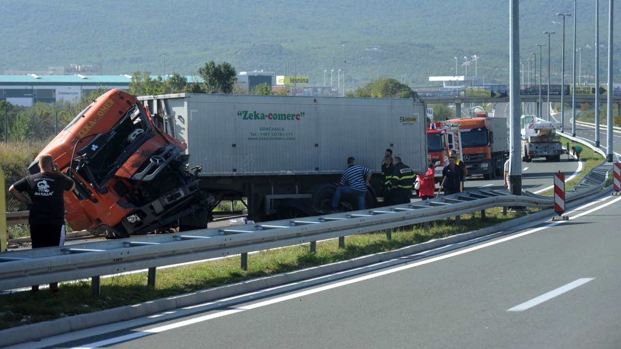 komunikacijskog centra PU splitsko-dalmatinske, prevrnuo se šleper marke Mercedes, bosansko-hercegovačkih tablica.