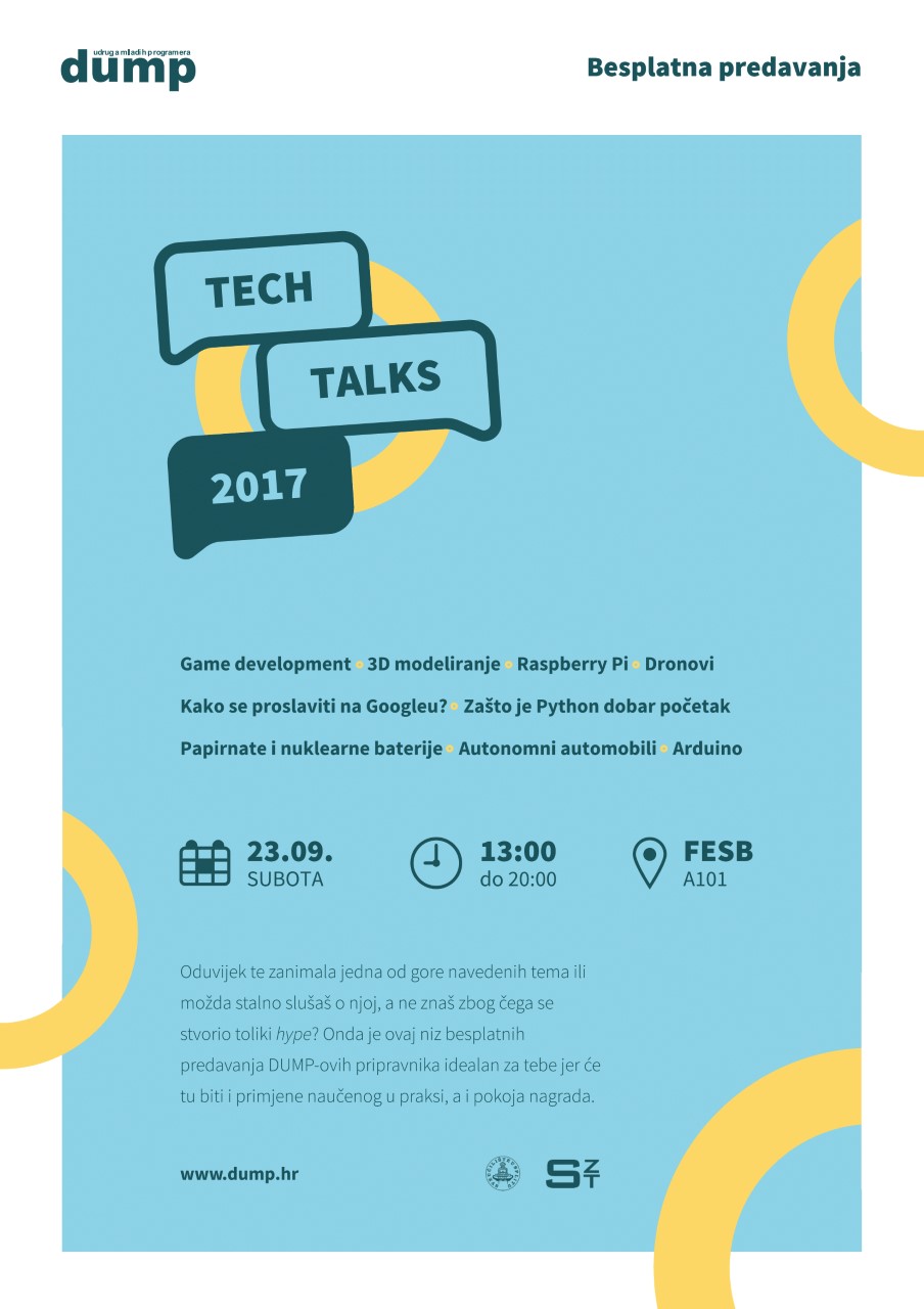 Tech Talks je događaj na kojem će pripravnici kroz devet predavanja pokazati znanja i vještine stečena kroz ovogodišnji DUMP Internship, program u kojem se traže budući članovi Udruge. Oni će predstaviti aktualne teme iz svijeta tehnologije na zabavan i zanimljiv način, a za svakoga će se pronaći ponešto: od izrade video igara, preko dronova i automobila koji voze sami, pa sve do nuklearnih baterija. Kroz sama predavanja provući će se nagradne igre u kojima će svi moći sudjelovati, a oni najsretniji imat će priliku u praksi primijeniti stvari naučene na predavanju.